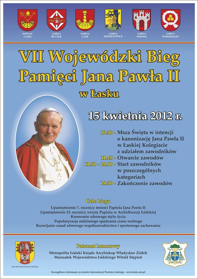 Władze samorządowe Powiatu Łaskiego przy współpracy z władzami samorządowymi gmin z terenu powiatu i środowiskiem sportowym zapraszają dzieci, młodzież i osoby dorosłe na „VII Wojewódzki Bieg Pamięci Jana Pawła II w Łasku”. Bieg wpisuje się w obchody 7.rocznicy śmierci i 25. rocznicy wizyty naszego Wielkiego Rodaka w Łodzi.