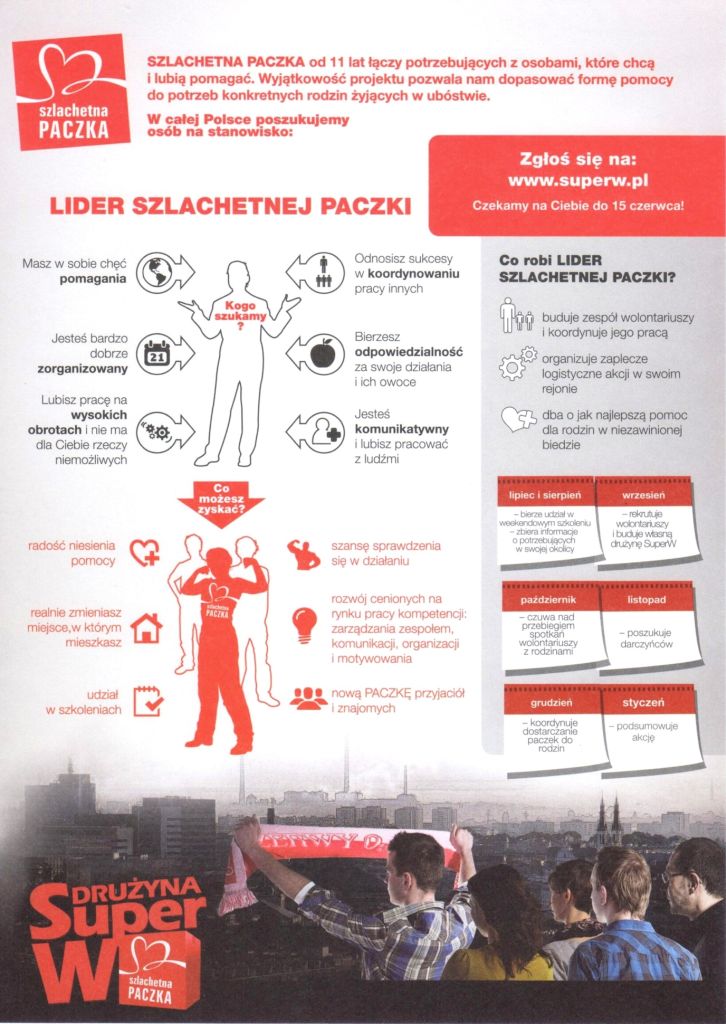 Już od 11 lat działa ogólnopolska akcja świątecznej pomocy najuboższym – Szlachetna Paczka (do 2009 roku Świąteczna Paczka). Każdego roku poszerzany jest obszar działania akcji. Do dnia 15 czerwca prowadzone są nabory zgłoszeń na stanowisko Liderów Szlachetnej Paczki, którzy zbudują zespół wolontariuszy m. in. na terenie naszej gminy. Więcej informacji o ogólnopolskiej akcji świątecznej pomocy na stronie www.szlachetnapaczka.pl. Nabory zgłoszeń na liderów: www.superw.pl.