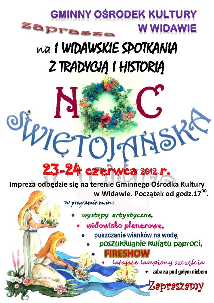 Mając na uwadze potrzebę wzbogacenia oferty kulturalnej oraz pielęgnowanie i rozwój tradycji kulturowej gminy Widawa, Gminny Ośrodek Kultury w Widawie organizuje I WIDAWSKIE SPOTKANIA Z TRADYCJĄ I HISTORIĄ – NOC ŚWIĘTOJAŃSKA 2012.