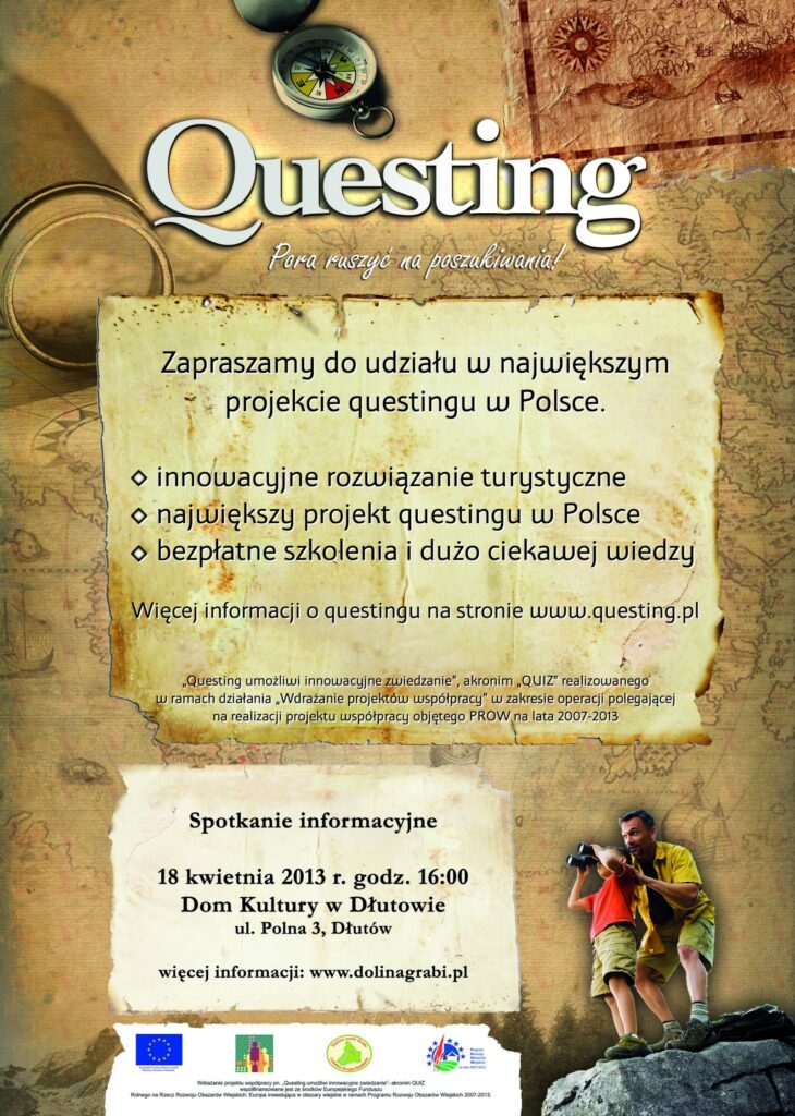 Pierwsze spotkanie informacyjne odbędzie się dnia 18 kwietnia 2013 roku o godz. 16:00 w sali posiedzeń Domu Kultury w Dłutowie (Dłutów, ul. Polna 3) . Spotkanie skierowane jest do przedstawicieli administracji samorządowej, ośrodków kultury, szkół, organizacji pozarządowych, grup nieformalnych oraz wszystkich pasjonatów turystyki. Poprowadzą je trenerzy questingu, z którymi będziemy współpracowali w ramach realizacji projektu. Koszty dojazdu uczestnik pokrywa we własnym zakresie.
