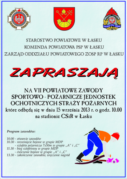 Starostwo Powiatowe w Łasku, Komenda Powiatowa PSP w Łasku oraz Zarząd Oddziału Powiatowego Związku Ochotniczych Straży Pożarnych RP w Łasku zapraszają na VII Powiatowe Zawody Sportowo-Pożarnicze jednostek Ochotniczych Straży Pożarnych.