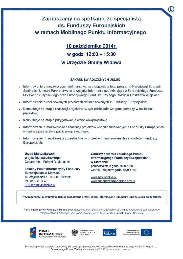 Spotkanie odbędzie się w dniu 10 października 2014r. w godz. 12:00 – 15:00 w Urzędzie Gminy Widawa.
