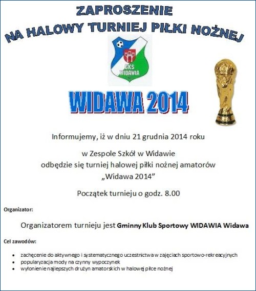 Gminny Klub Sportowy WIDAWIA Widawa serdecznie zaprasza na Halowy Turniej Piłki Nożnej „Widawa 2014”. Turniej zostanie rozegrany w hali sportowej Zespołu Szkół w Widawie, w niedzielę, 21 grudnia 2014 r. Początek turnieju o godzinie 8.00.