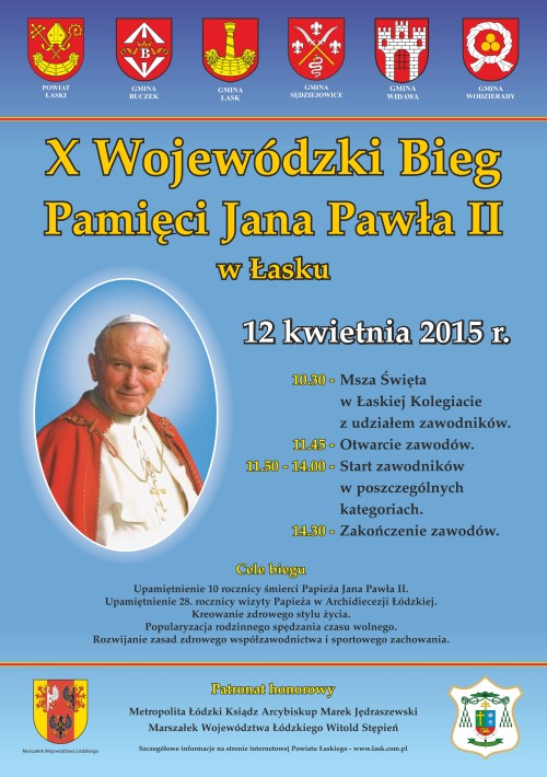12 kwietnia 2015 r. odbędzie się kolejna edycja Wojewódzkiego Biegu Pamięci Jana Pawła II. W tym roku obchodzimy 10 rocznicę śmierci naszego Wielkiego Rodaka. Powiat Łaski nieprzerwanie od 2006 roku we współpracy z władzami samorządowymi gmin z terenu Powiatu Łaskiego, Księdzem Prałatem, Proboszczem Parafii Niepokalanego Poczęcia NMP i Św. Michała Archanioła w Łasku oraz środowiskiem sportowym organizuje Bieg Pamięci Jana Pawła II w Łasku dla dzieci, młodzieży i osób dorosłych.