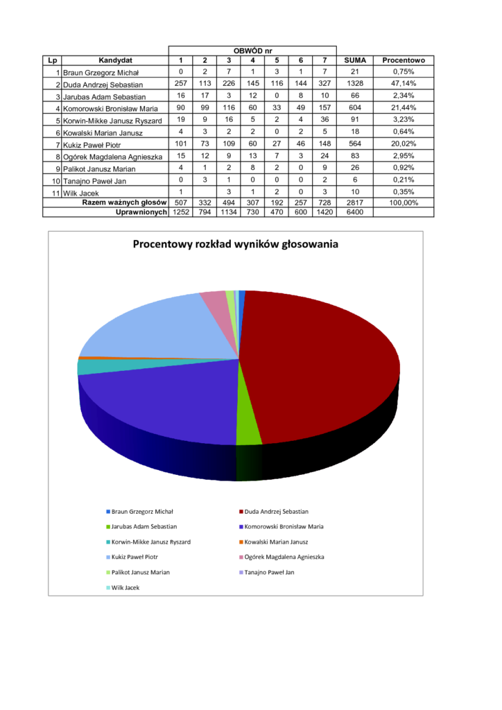 Poniżej zamieszczamy zestawienie z wyników głosowania w wyborach Prezydenta Rzeczypospolitej Polskiej, zarządzonych na dzień 10 maja 2015 roku, sumaryczne oraz z podziałem na poszczególne obwody.