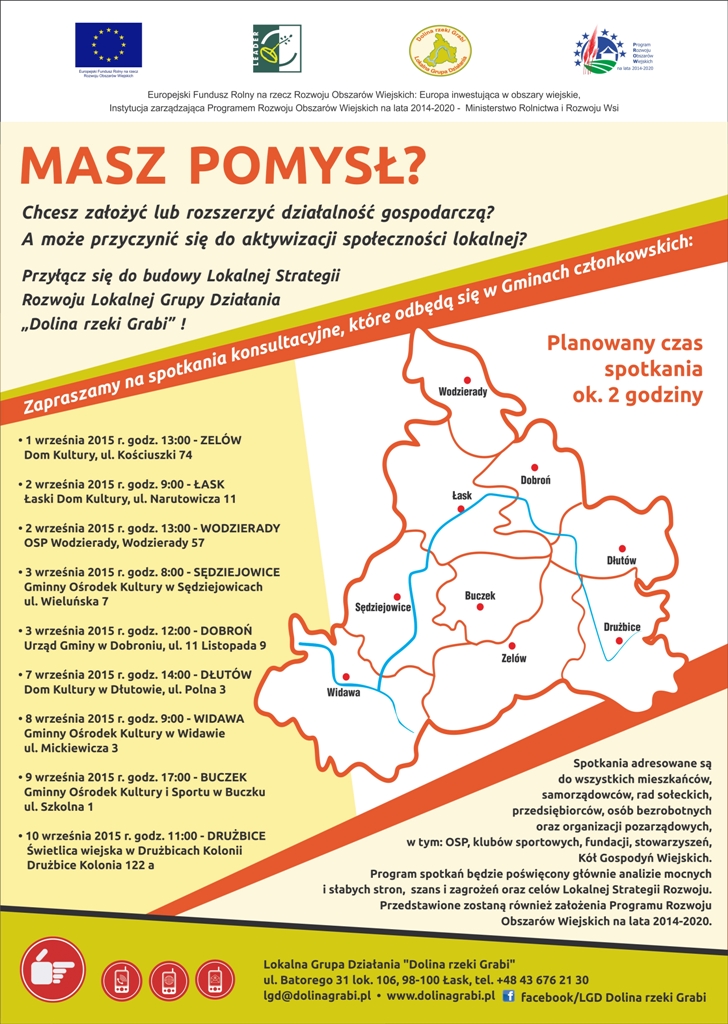 W związku z budową Lokalnej Strategii Rozwoju, Lokalna Grupa Działania „Dolina rzeki Grabi” zaprasza na konsultacje społeczne, które odbędą się w każdej gminie członkowskiej w pierwszej połowie września.