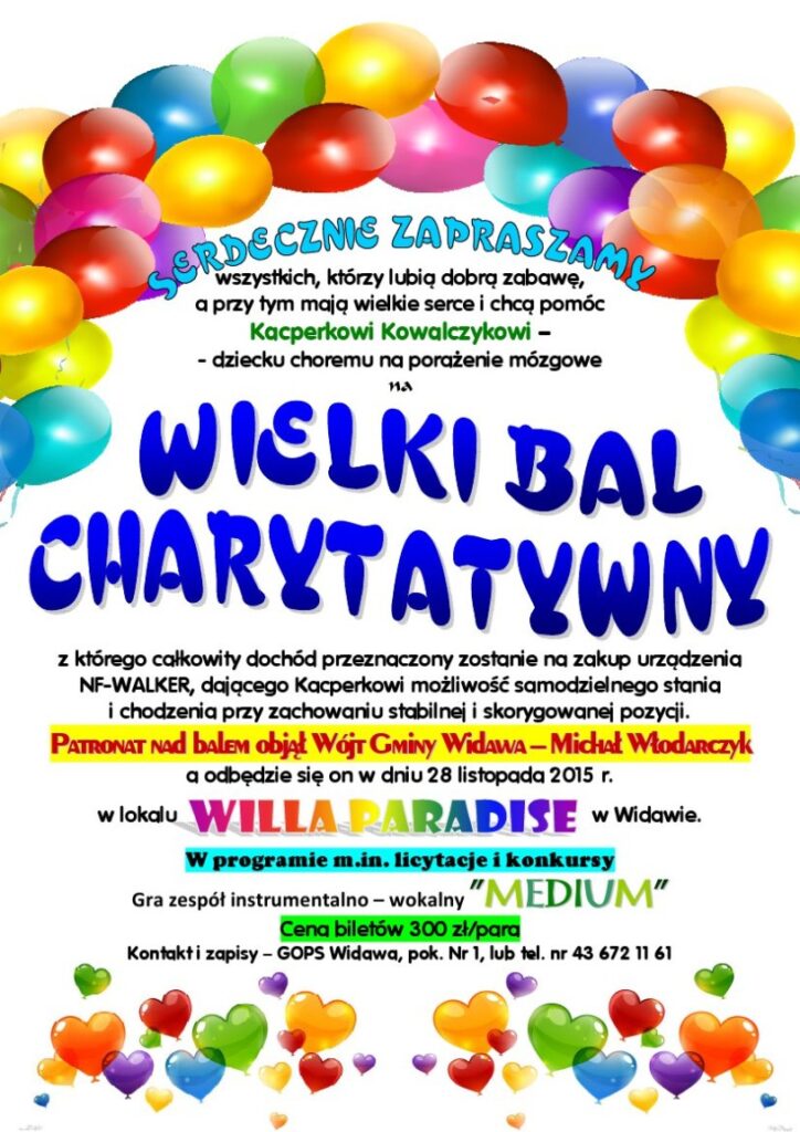 Wójt Gminy Widawa, Samodzielny Publiczny Zakład Podstawowej Opieki Zdrowotnej i Gminny Ośrodek Pomocy Społecznej w Widawie mają zaszczyt serdecznie zaprosić wszystkich, którzy lubią dobrą zabawę, a przy tym mają wielkie serce i chcą pomóc, na WIELKI BAL CHARYTATYWNY, który odbędzie się 28 listopada br. w lokalu „WILLA PARADISE” w Widawie.